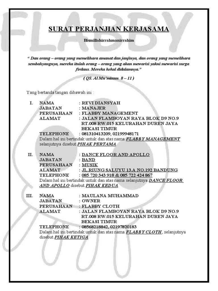 Contoh Surat Perjanjian Kerjasama Management Artis Kumpulan