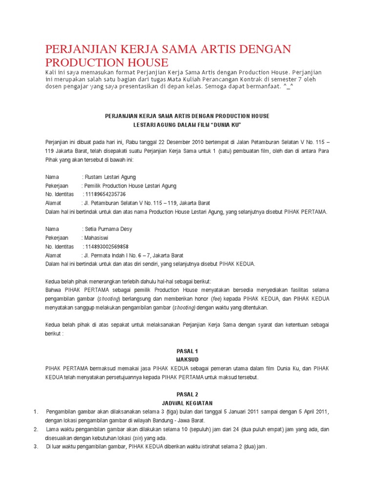 Contoh Kontrak Kerja Artis Dan Manajer