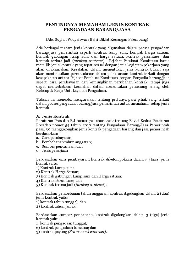Pdf Pentingnya Memahami Jenis Kontrak Pengadaan Barang Jasa