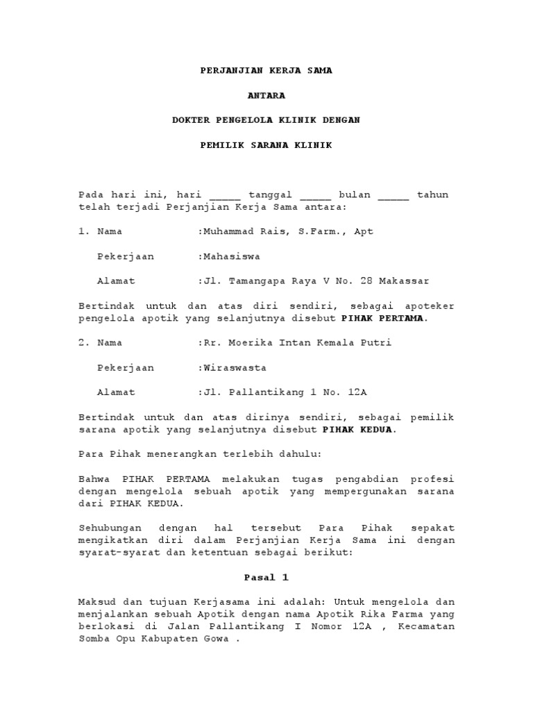Format Perjanjian Antara Managemen Klinik Dan Apoteker