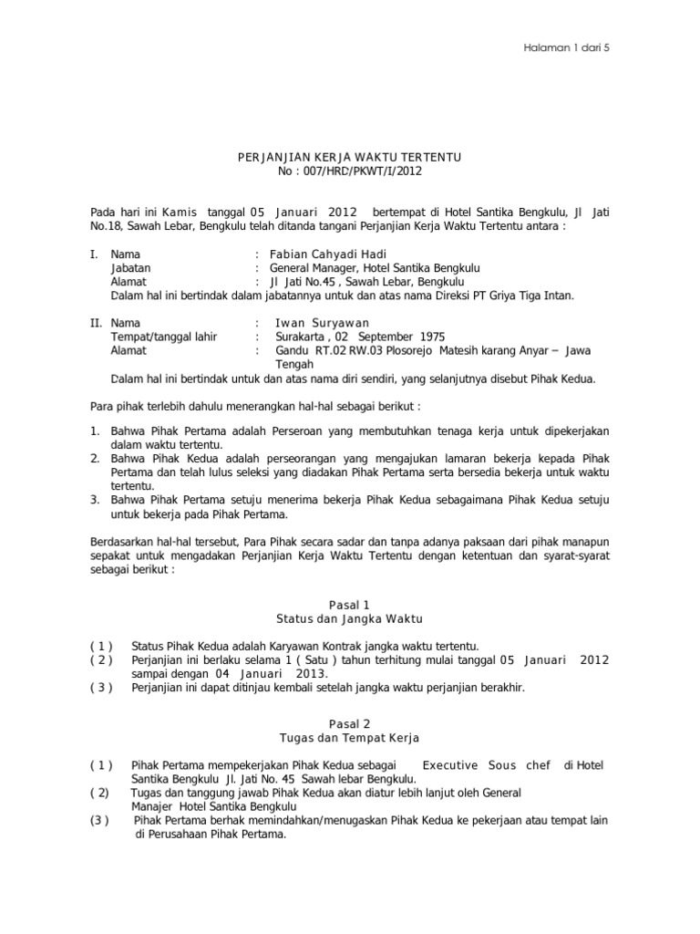 Contoh Surat Perjanjian Kerja Waktu Tertentu Dengan 9 Pasal