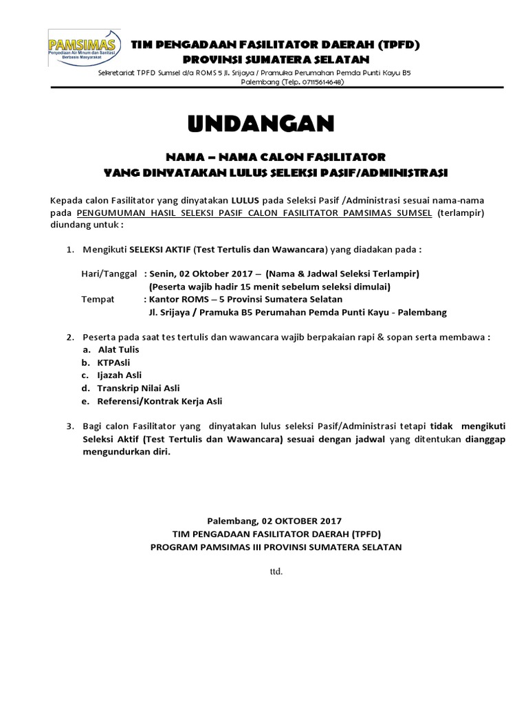 Lampiran 1 Hal Kepada Yth A Fm Pamsimas Ta 2018 2 Undangan Pelatihan Penyegaran Bagi Fasilitator Pdf Document