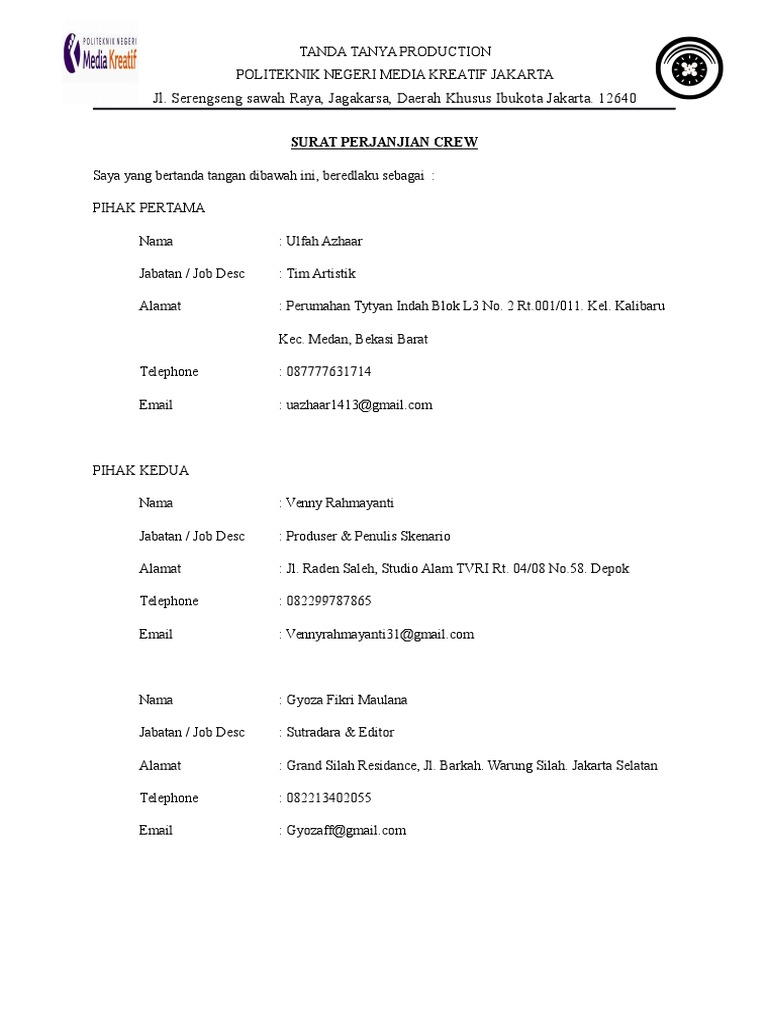 Contoh Surat Perjanjian Crew