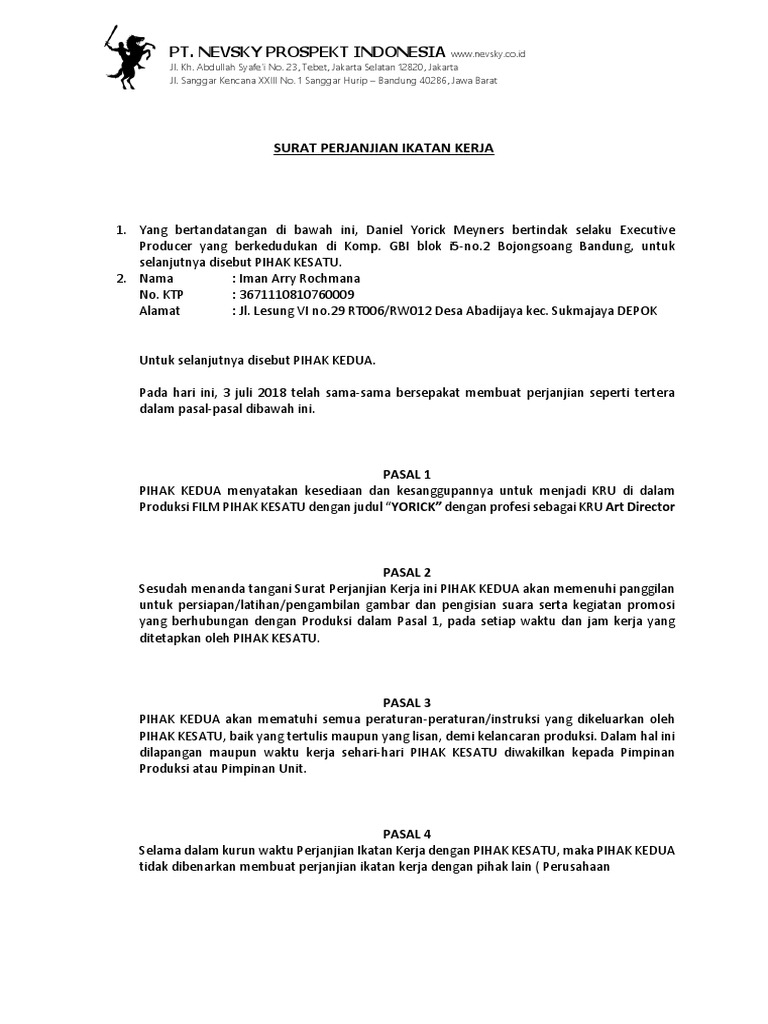 Contoh Perjanjian Kontrak Kerja