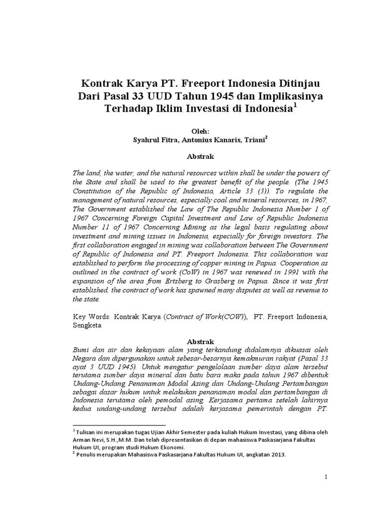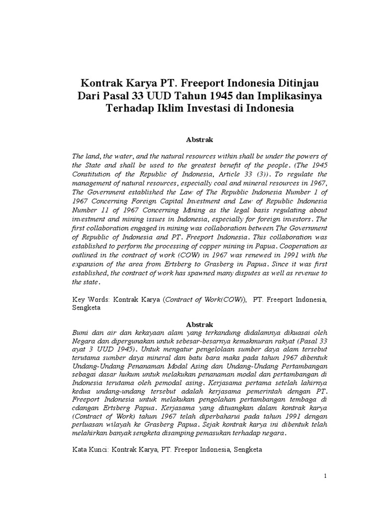 Kontrak Karya Pt Freeport Ditinjau Dari Pasal 33 Uud 1945