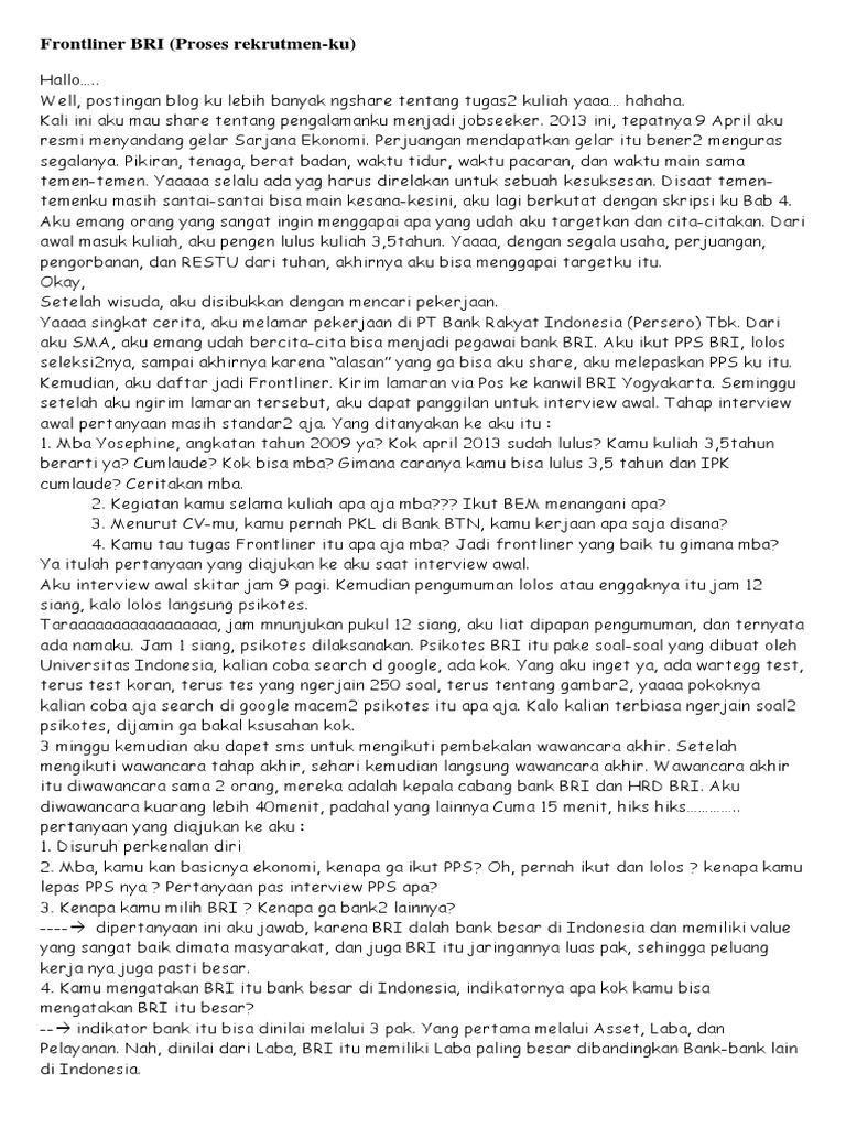 Penerimaan Tenaga Kerja Frontliner Pt Bank Rakyat Indonesia Persero Tbk Hingga 10 Mei 2019 Rekrutmen Lowongan Kerja Bulan Agustus 2020