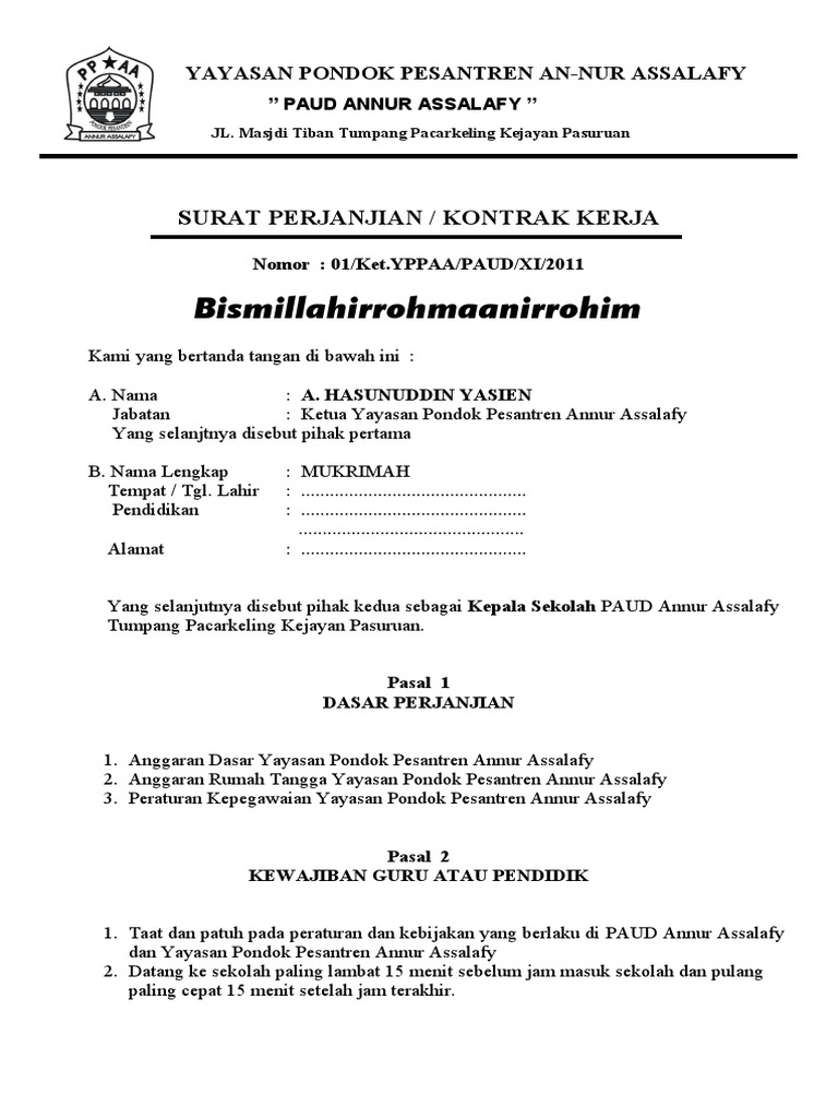 Contoh Surat Perjanjian Kontrak Kerja Guru Paud Format Microsoft