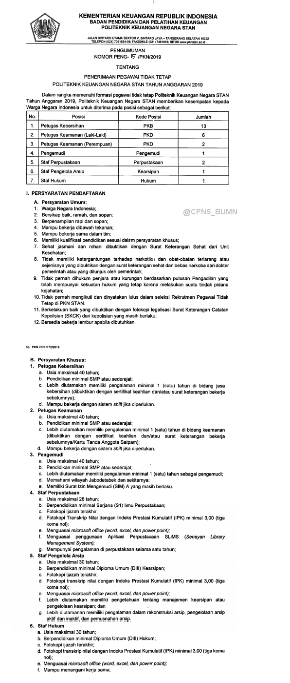 Rekrutmen Seleksi Pegawai Tidak Tetap Politeknik Keuangan Negara Stan Tingkat Smp D3 S1 Rekrutmen Lowongan Kerja Bulan Agustus 2020