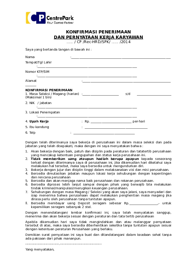 Contoh Surat Perjanjian Kerja Karyawan Lengkap Karyaone
