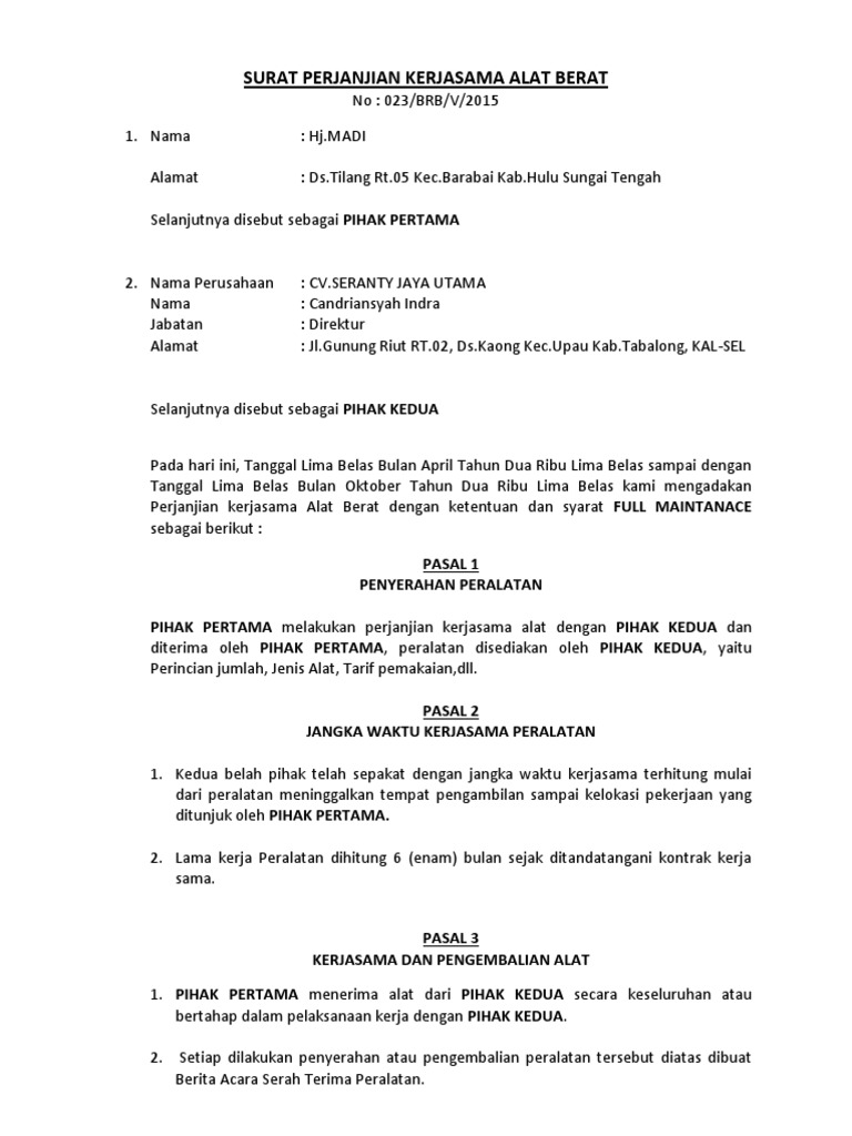 Surat Perjanjian Kerjasama Alat Berat