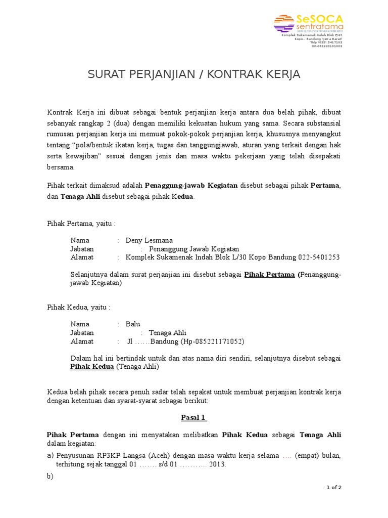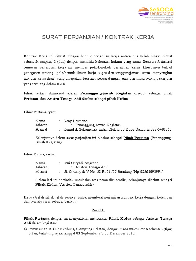 Doc Kontrak Kerjasama Dengan Tenaga Ahli Perencanaan Dr Adramicha Branik Academia Edu