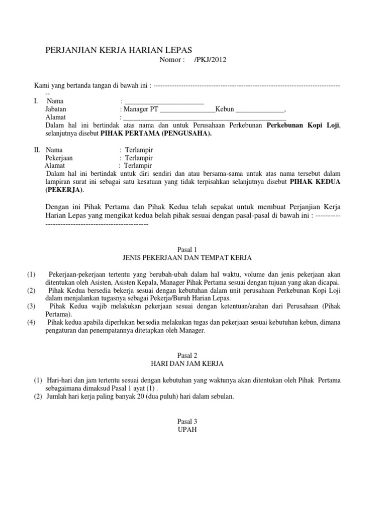 Doc Contoh Surat Perjanjian Kerja Harian Lepas Perwitasari