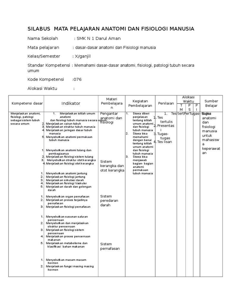 Silabus Mata Pelajaran Anatomi Dan Fisiologi Manusia
