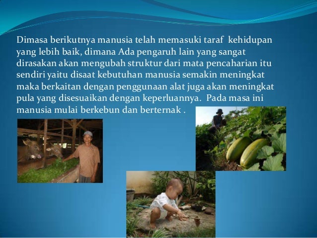 Mata pencaharian manusia prasejarah. Sebelum mengenal lebih jauh tentang bagaimana sistem mata pencaharian alangkah baiknya kalau kita mengenal terlebih dahulu dari segi arti sistem. Dimasa ini manusia telah memasuki taraf kehidupan yang lebih baik dimana pengenalan sistem bercocok tanam tingkat sederhana ini akan sangat mempengaruhi budaya dan peradaban tingkat lanjut karena manusia pada masa ini hidupnya sudah mulai menetap dengan menempati rumah rumah yang. Pada masa prasejarah cara melakukan mata pencaharian sangat terbatas seperti berburu dan meramu makanan. Sebagai pendukung dari kegiatan mereka dipengaruhi oleh iklim kesuburan tanah dan keadaan binatang buruan.