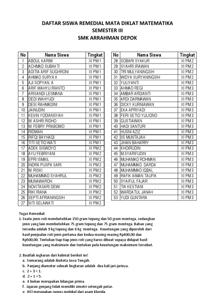 Daftar Siswa Remedial Mata Diklat Matematika Semester Iii Smk