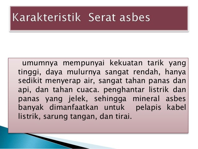 Akan tetapi ada baiknya bila kamu tidak menggunakannya karena bahaya yang ditimbulkannya. Contohnya adalah benzena dan asbes. Selain itu asbes relatif sukar larut daya regang tinggi dan tahan asam hanya amfibol abraham 1994. Asbes adalah mineral alami yang telah ditambang dan digunakan selama berabad abad karena ketahanannya panas dan ketahanan terhadap bahan kimia.