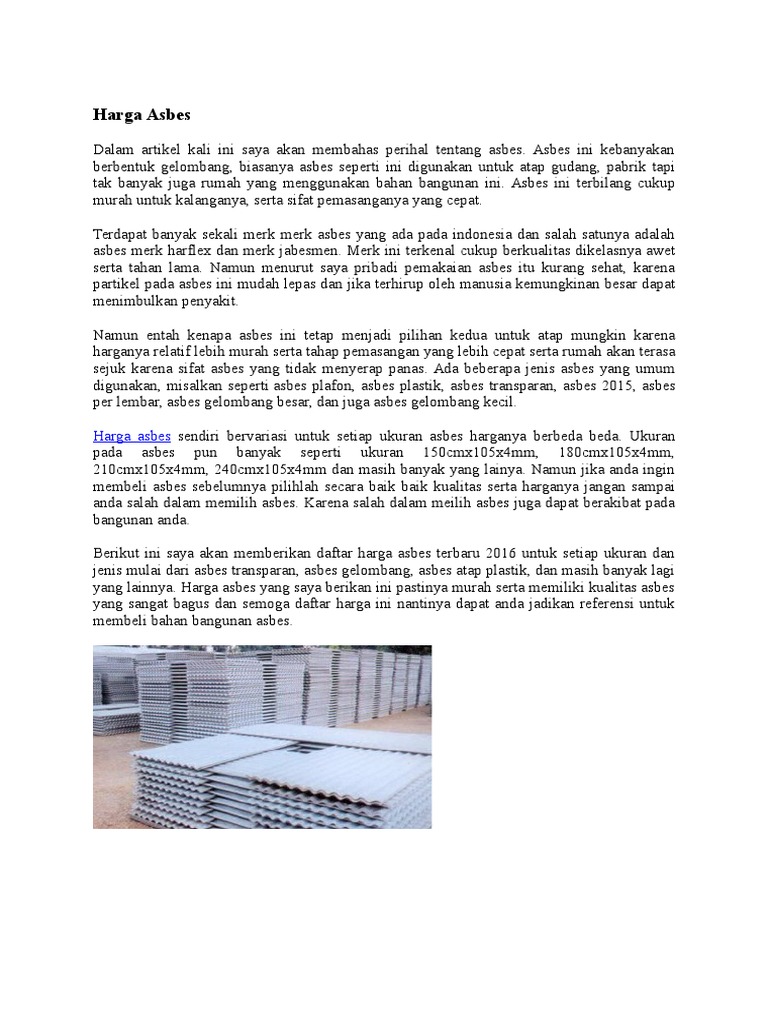 Dalam 4 5 tahun atap asbes harus diganti meskipun belum rusak untuk menghindari anda dari penyakit paru paru dan gangguan pernapasan lainnya. Jangan ragu untuk membeli atap yang lebih ramah lingkungan dan aman bagi tubuh kamu. Asbes umum digunakan sebagai bahan baku bangunan karena dinilai tahan api tahan lama dan sebagai bahan penutup yang efisien murah. Banyak orang bilang atap asbes berbahaya itu semua karena bahan dasar pembuatan asbes adalah karbon sehingga dalam penggunaan jangka panjang tentu serpihannya akan menimbulkan efek jangka panjang.