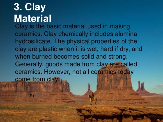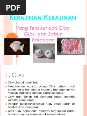 Clay berari tanah liat. Cuplikan dicetak berbentuk lempengan kecil dan dikeringkan dalam temperatllr nwng kurang lebih 2 3 hari. Saat ini para pengrajin clay berlomba lomba untuk membuat kerajinan dari bahan clay yang lebih kreatif dan inovatif. Clay tanah liat sifat keadaan bahan dari clay adalah berbutir kasar rapuh dan tidak plastis jika dibandingkan dengan lempung sedimenter clay mengandung hidrated alumunium silica al2o3 sio h2o yang berfungsi mempermudah proses pembentukan keramik mempunyai sifat plastik sehingga mudah dibentuk mempunyai daya ikat bahan baku yang tidak plastis.