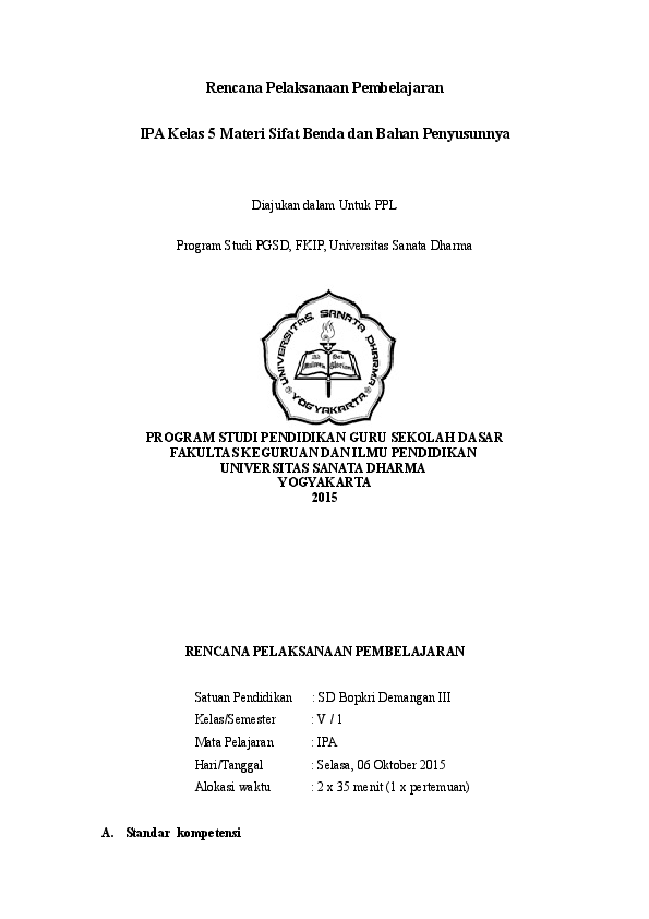 Doc Rencana Pelaksanaan Pembelajaran Ipa Kelas 5 Materi Sifat