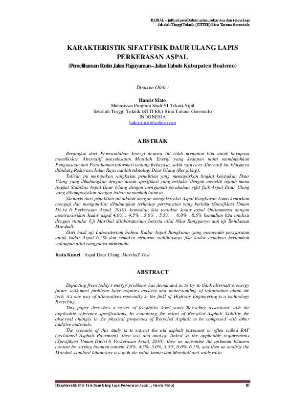 Pdf Karakteristik Sifat Fisik Daur Ulang Lapis Perkerasan Aspal Stitek Bina Taruna Gorontalo Academia Edu