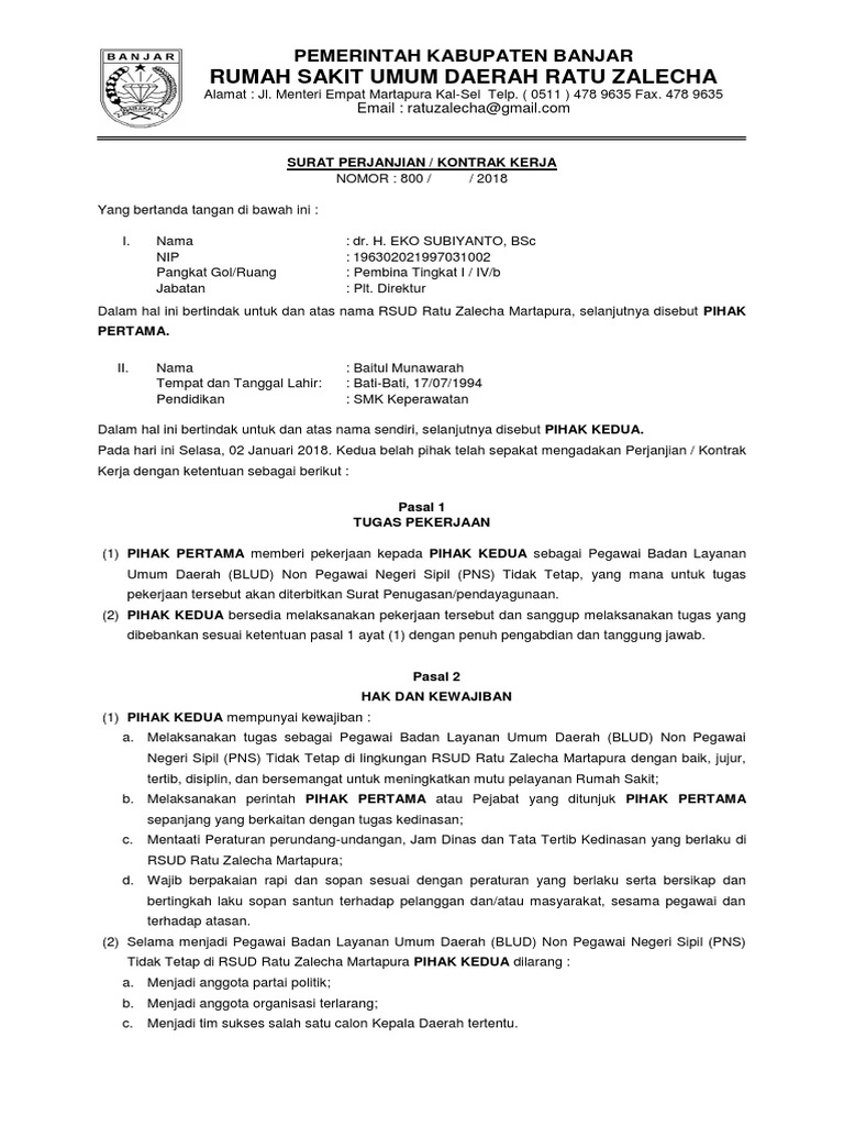 Surat Perjanjian Kerja Rsud Ratu Zalecha Martapura